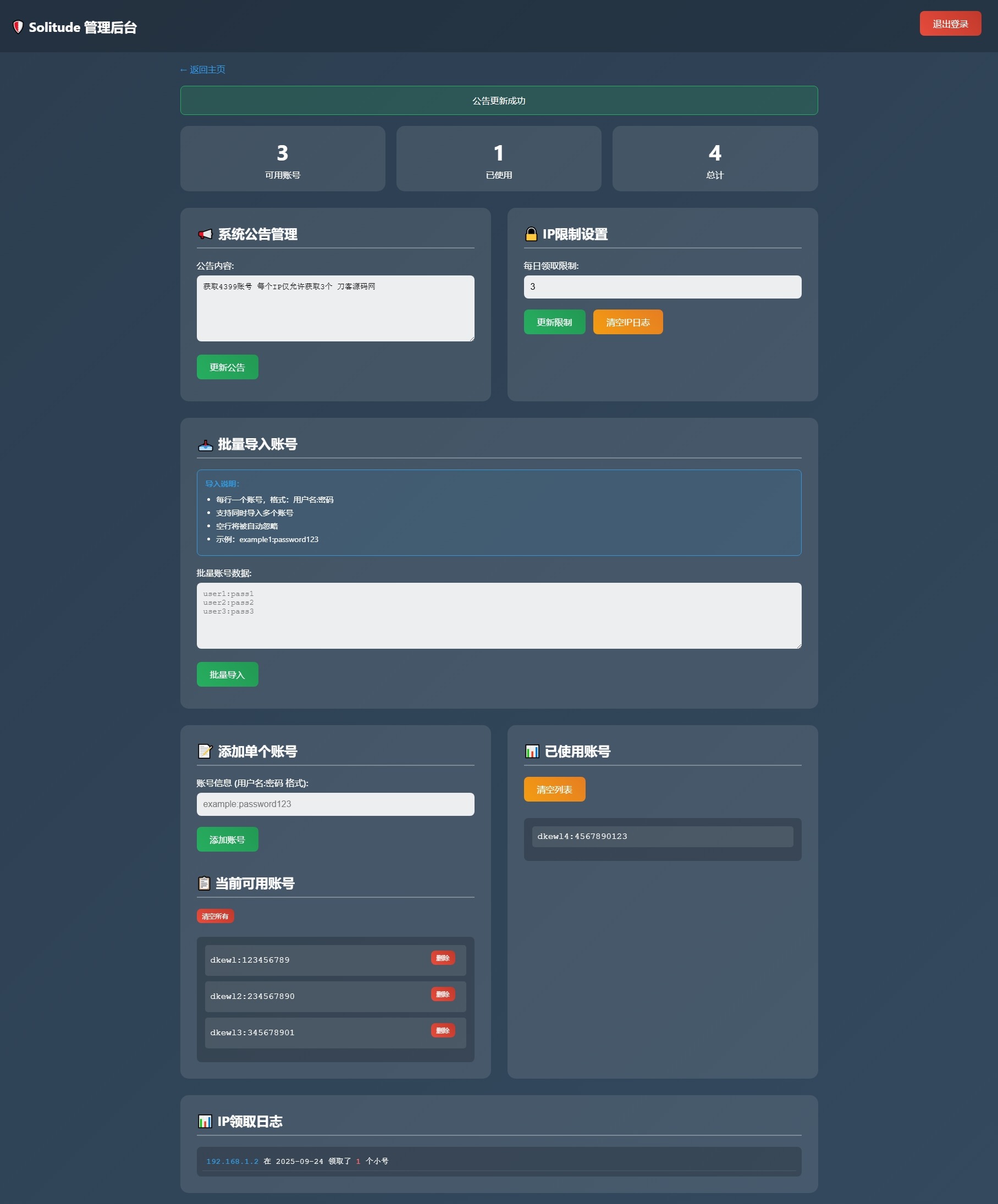 小号分发 卡密分发系统网站源码 轻量化文龙站长5天前更新关注私信0155小号分发 卡密分发系统网站源码 轻量化此内容为免费资源,请登录后查看¥0 登录查看免费资源 简介: 小号分发 卡密分发系统网站源码 轻量化 此为小号分发卡密系统源码,专用于分发小号库存账号或卡密等使用,不过规定每个IP仅能领取3次,也可视作小号分发工具。 已做过简易测试,感兴趣者可自行部署使用! 图片: © 版权声明 版权声明 1 本网站名称:文龙资源站 2 本站永久网址:https://www.wlzy.top 3 本网站的文章部分内容可能来源于网络,仅供大家学习与参考,如有侵权,请联系站长 QQ5348008进行删除处理。 4 本站一切资源不代表本站立场,并不代表本站赞同其观点和对其真实性负责。 5 本站一律禁止以任何方式发布或转载任何违法的相关信息,访客发现请向站长举报 6 本站资源大多存储在云盘,如发现链接失效,请联系我们我们会第一时间更新。 THE END源码主题 喜欢就支持一下吧点赞5 分享QQ空间微博QQ好友海报分享复制链接收藏